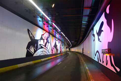 Recently, the renovation of Port de Hal Tunnel in Brussels has been completed. The new intelligent infrastructure is fully controllable from the outside, without having to enter inside as well as features an artistic element. Travellers can enjoy colourful graffiti illuminated by making space “a colourful crossing”, as suggested by the lighting designer Valentine Geloen, from studio Radiance35. While renovating the tunnel more attention was given to safety. Already lit with green LED lights, in case of an incident, the emergency exits become even more visible, due to the newly installed Woody spotlights by iGuzzini.